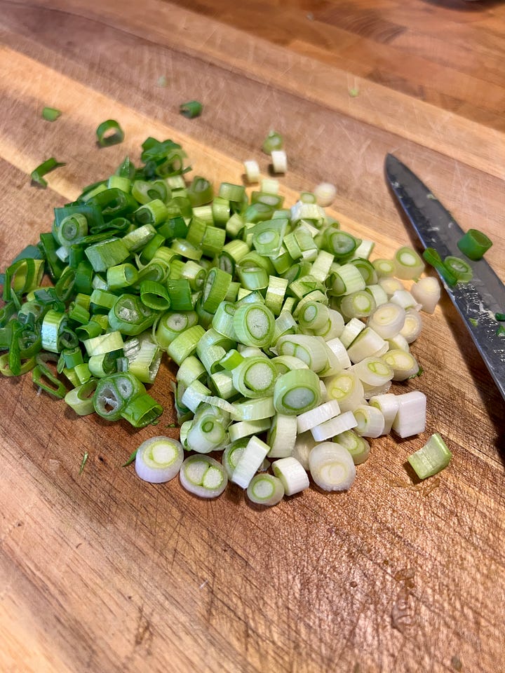 Pica el apio en trozos finos y corta los ajetes en rodajas delgadas.