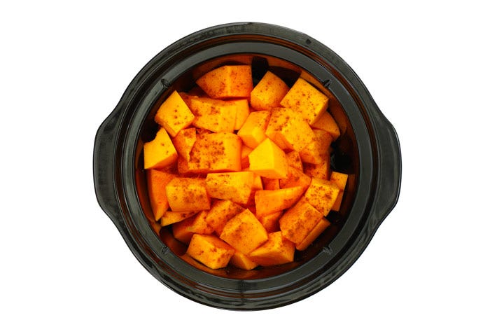 Corta la calabaza en trozos gruesos, colócala en el slow cooker, añade la sidra o al apple cider y espolvorea con 1/4 de la mezcla de especias.