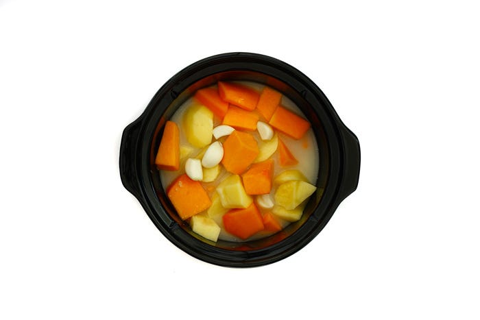 Coloca la calabaza, los ajos y la patata en un pasapuré y deja que la pulpa de calabaza y patata caiga en el slow cooker caliente. Añade líquido hasta que tenga la densidad que quieras: más líquida si vas a usar el puré como primer plato, más cremosa o sólida si lo vas a usar como guarnición.
