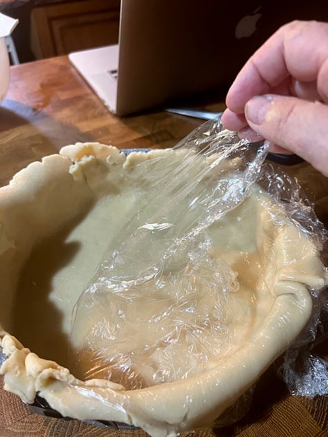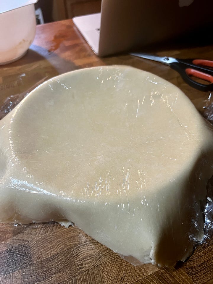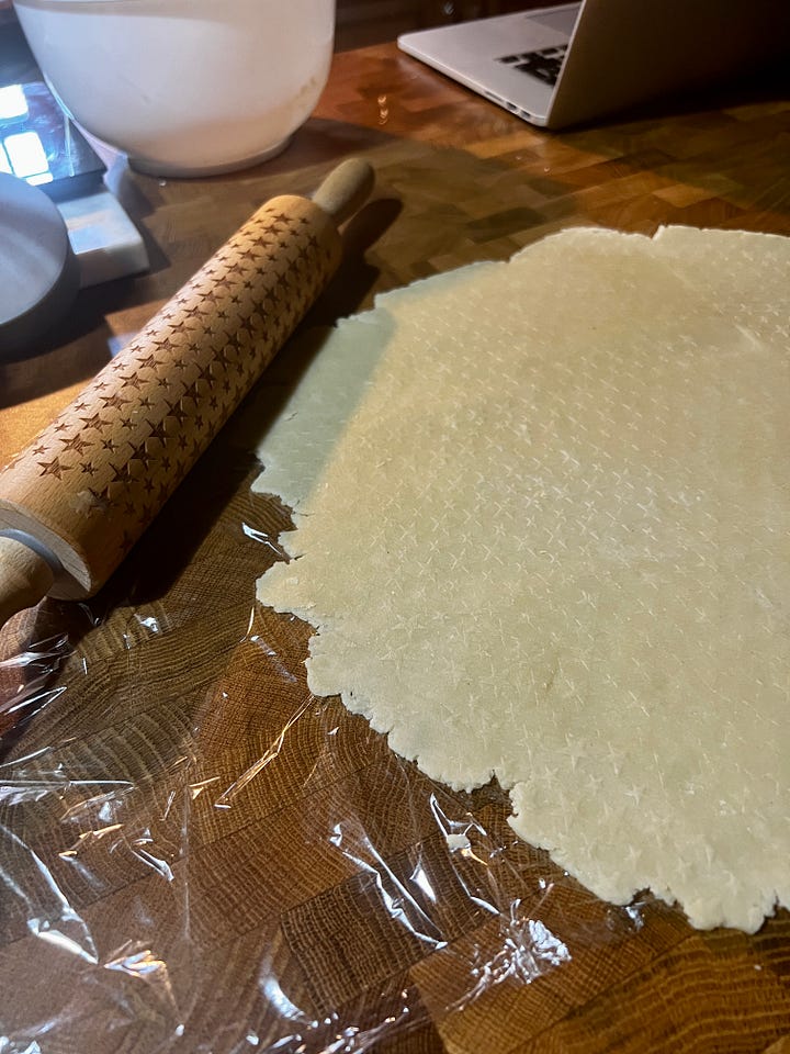Estira la masa sobre una lámina de film de cocina con ayuda de un rodillo hasta que tenga una medida adecuada para cubrir el fondo del molde y aproximadamente 4 o 5 centímetros en los bordes.