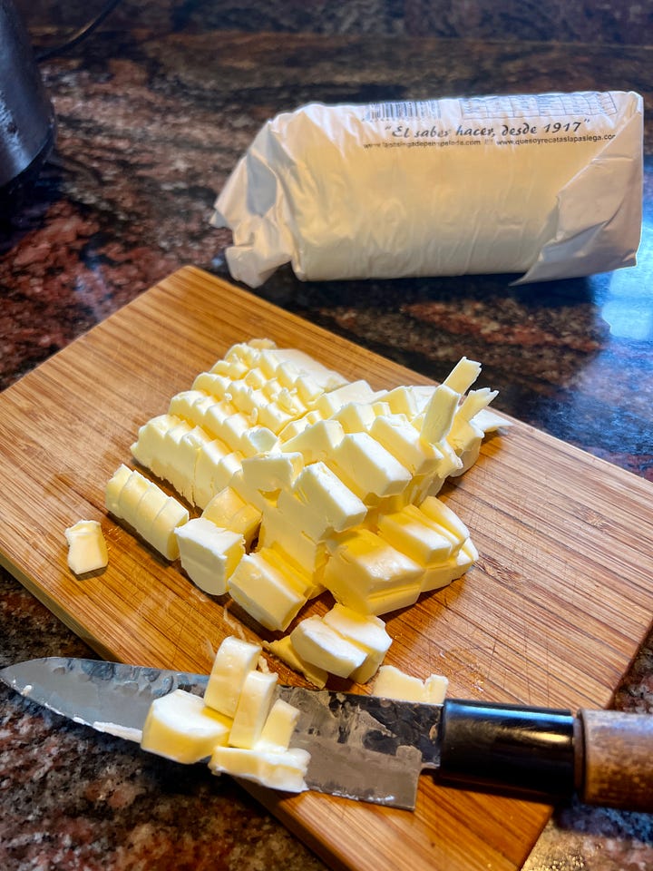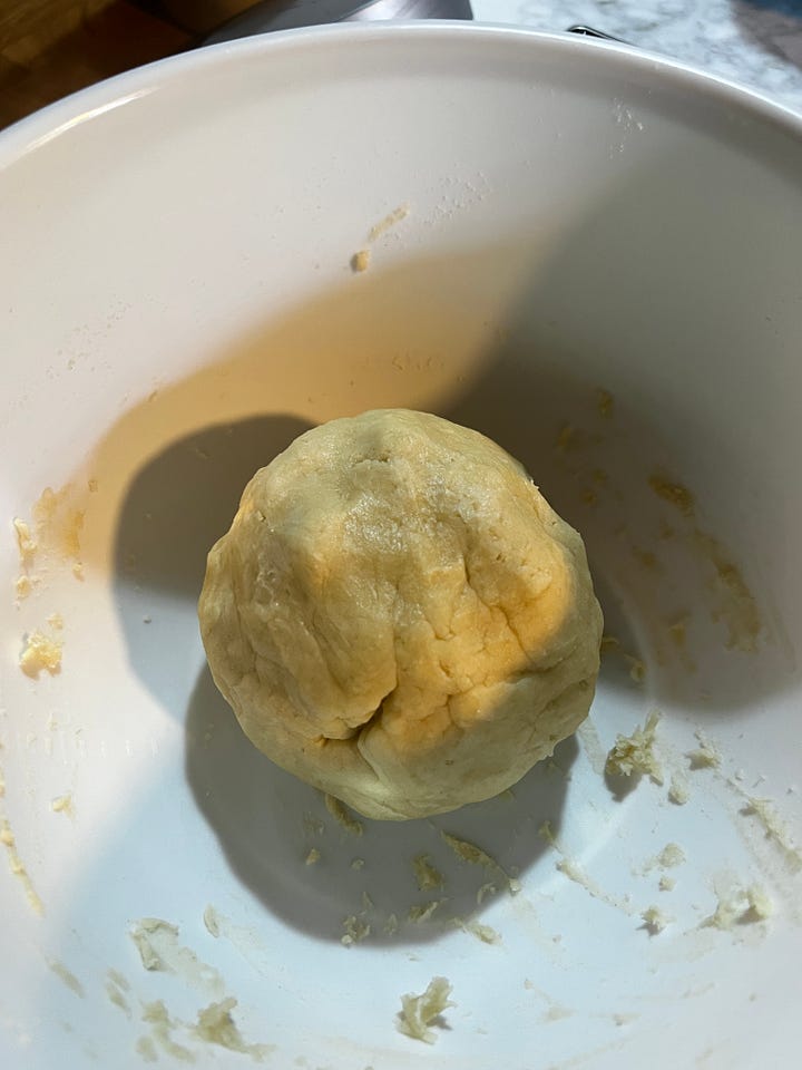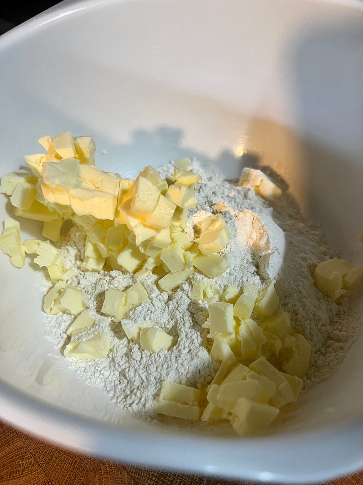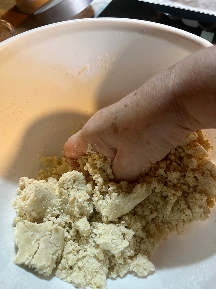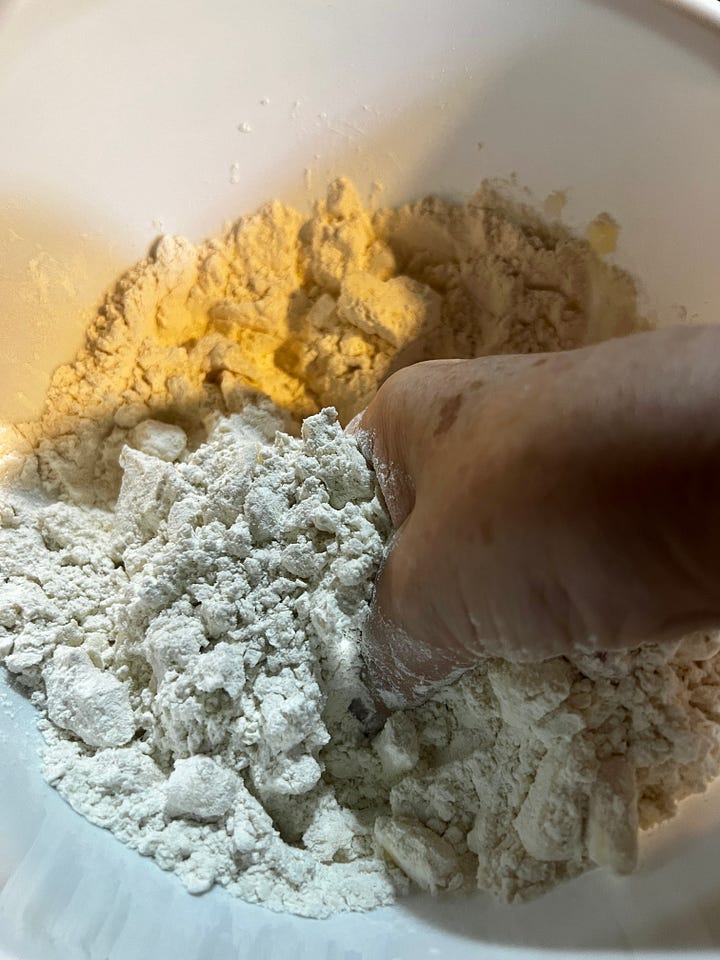 Coloca la mantequilla en un bol junto con la harina y una pizca de sal. Amasa con la mano hasta conseguir una textura arenosa.