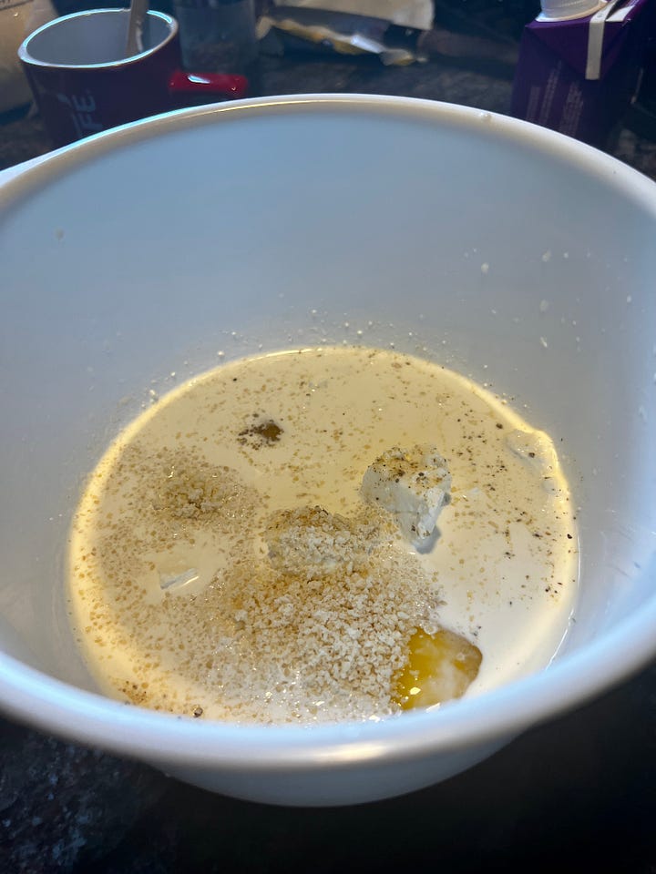 Mezcla la nata, los 4 huevos, la harina de almendra y 2 trozos de queso con una batidora de brazo.