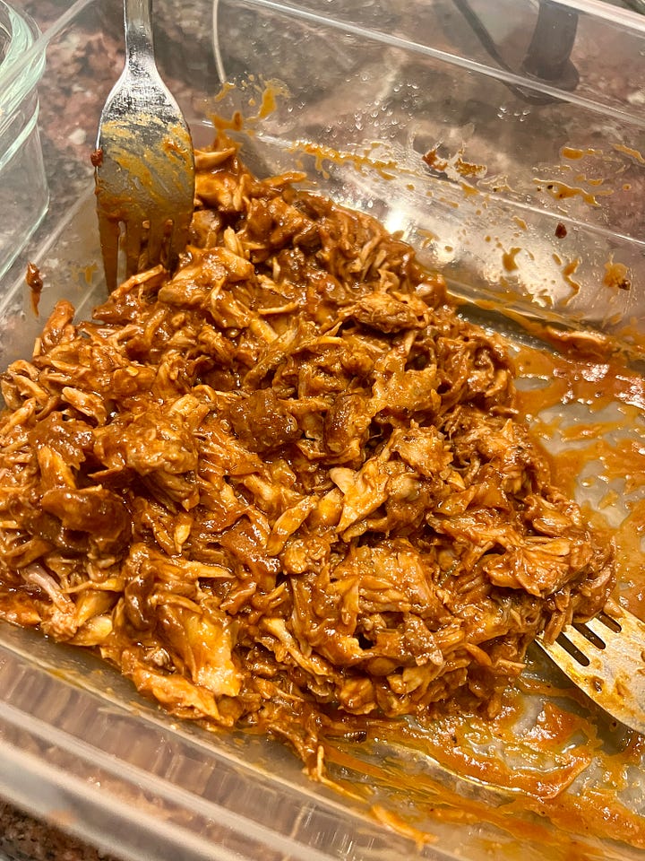 Desmiga la carne con ayuda de dos cuchillos y mézclala por completo con la salsa.