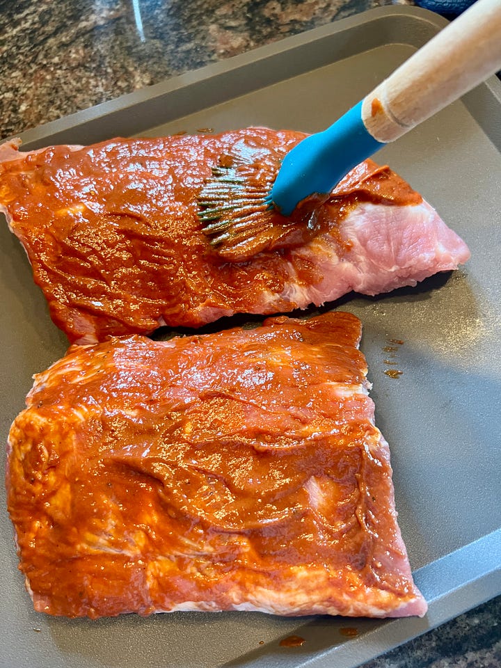 Embadurna la carne por los dos lados, dejando que quede una capa gruesa de la mezcla de tomate, mostaza y melaza.