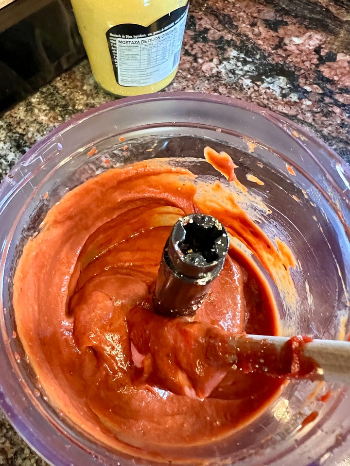 Mezcla en un pequeño procesador o con ayuda de la batidora, el tomate concentrado, la melaza, la mostaza, sal y pimienta.