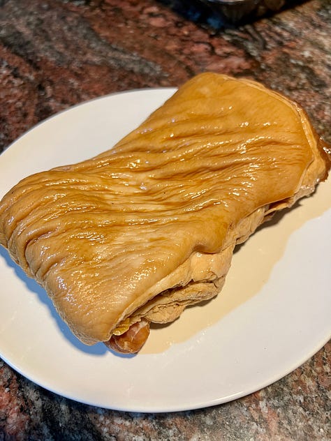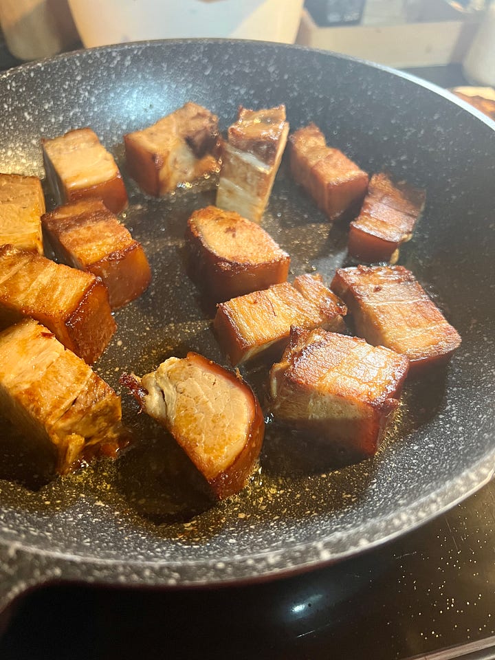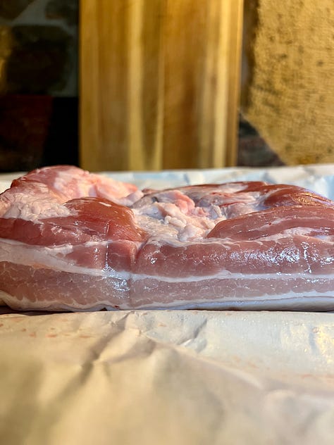 Después de un pequeño rifirrafe con el carnicero, que me quería vender una panceta delgadísima y desangelada, alegando que la panceta era así, encontré –al otro lado de la calle– una carnicería en la que la panceta era justo como la buscaba: gruesa y carnosa para que tuviera un buen mordisco.