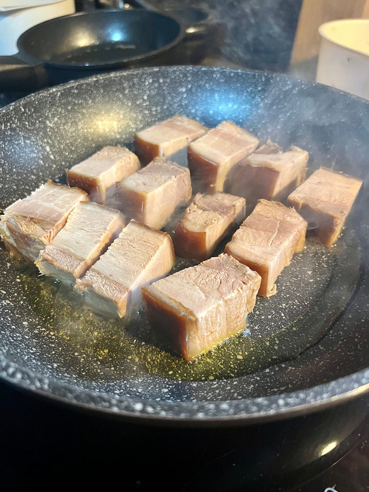 Prepara una sartén con un poco de aceite de oliva y dora los tacos a fuego medio por todos los lados largos hasta que queden dorados y la panceta esté caliente.