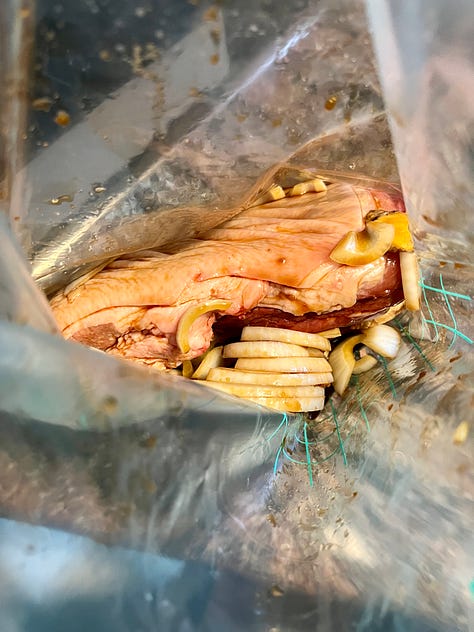 Vierte el contenido en una bolsa con cierre de zip grande, pon la panceta dentro, extrae todo el aire que puedas y ciérrala asegurándote de que quede bien sellada.
