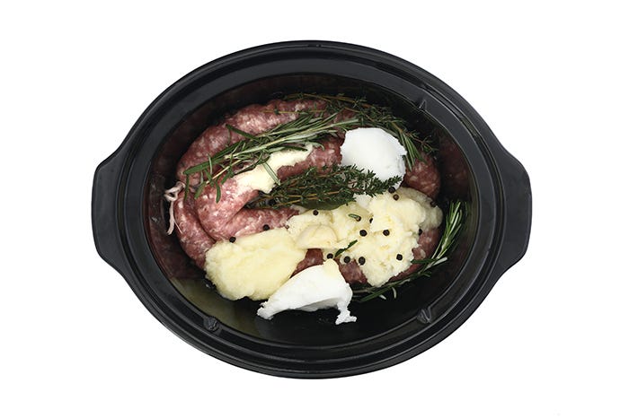 Coloca las salchichas en el slow cooker. Añade la grasa escogida, unas ramitas de romero y tomillo frescas, el laurel y unos 10 o 15 granos de pimienta negra y blanca enteros.