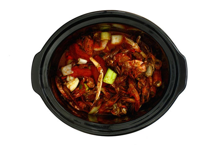 Es curioso –y lo verás cuando la hagas– observar en qué quedan las carcasas una vez terminada la salsa. Tras cocinar la farsa durante 4 horas, hay que aplastar los sólidos y triturarlos hasta obtener una pasta que, una vez colada, deja un residuo mínimo, porque toda la sustancia y la esencia de los caparazones se queda en la salsa americana. Tus sopas de pescado ya no serán las mismas, ¡tienes que probarla!