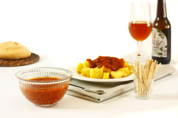 La salsa brava combina estupendamente con unas patatas fritas cortadas en trozos toscos. Es un aperitivo clásico que puedes acompañar también con una salsa de ajo y mayonesa.