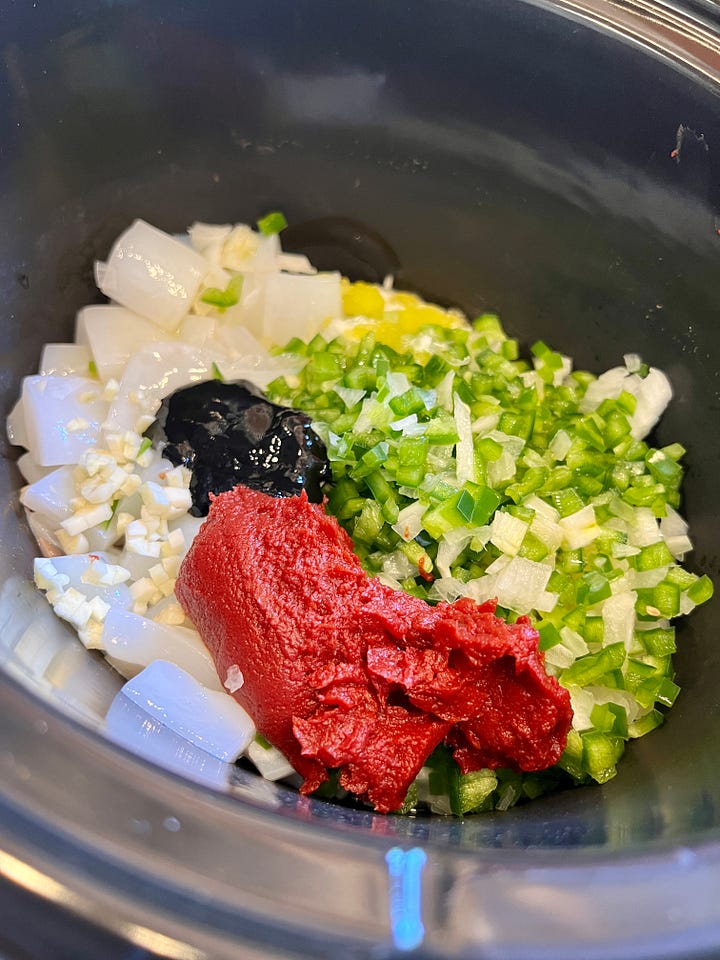 Pica la cebolla, el ajo y el pimiento muy finos, y pon la picada en la olla lenta.
