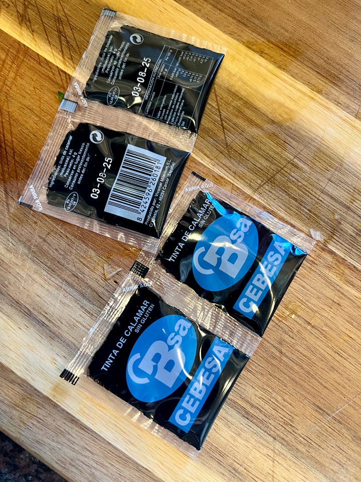 Hasta ahora siempre había comprado las tintas en la pescadería, en pequeños sobres refrigerados o congelados de 4 g. Esta vez las conseguí en un supermercado, en sobres, pero en la sección de salsas sin refrigerar. Desconocía que se vendieran en este formato. También se pueden encontrar en pequeños tarros en la misma sección.
