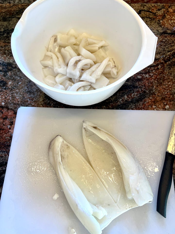 Pide en la pescadería que te preparen la sepia limpia, cortada en cuadrados y con los tentáculos de cada sepia separados en tres trozos.