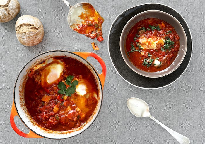 Las especias, la salsa harissa y el cilantro fresco son lo que separan a la shakshuka de un pisto o una fritada.