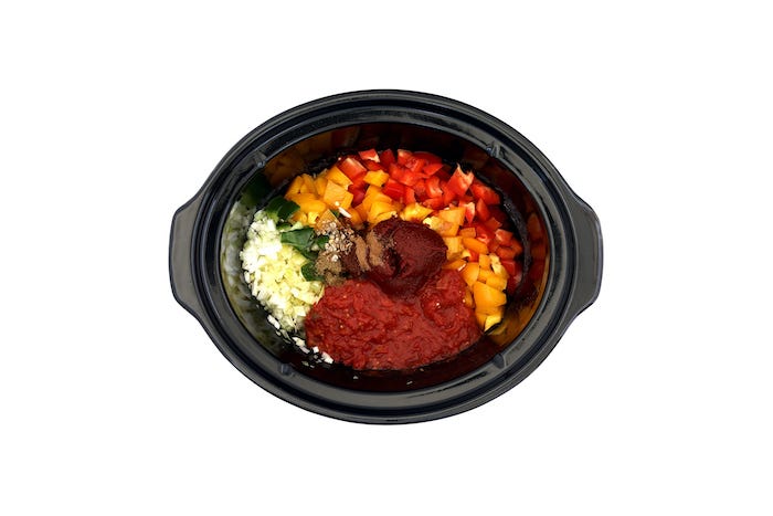Cocina durante 4 horas en ALTA o hasta que las hortalizas estén cocinadas y el tomate haya formado una salsa densa.