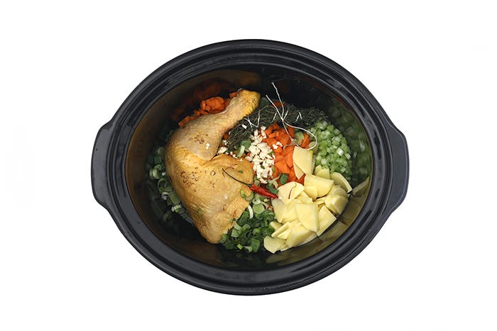 Sin apagar el slow cooker, saca el pollo a un plato, quita la piel, las ternillas y los huesos. Trocea la carne de pollo y devuélvela al slow cooker.