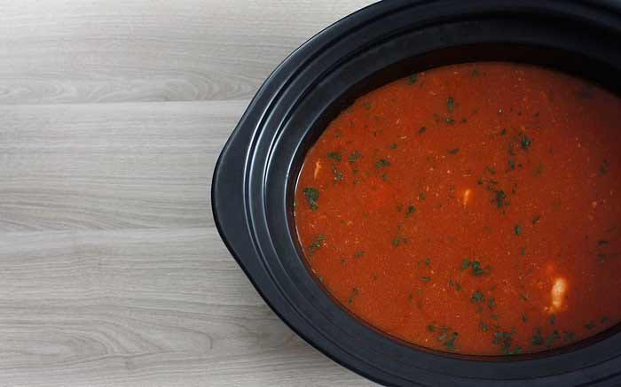 Cuando tengas el fumet hecho y colado, ponlo en el recipiente del slow cooker.
