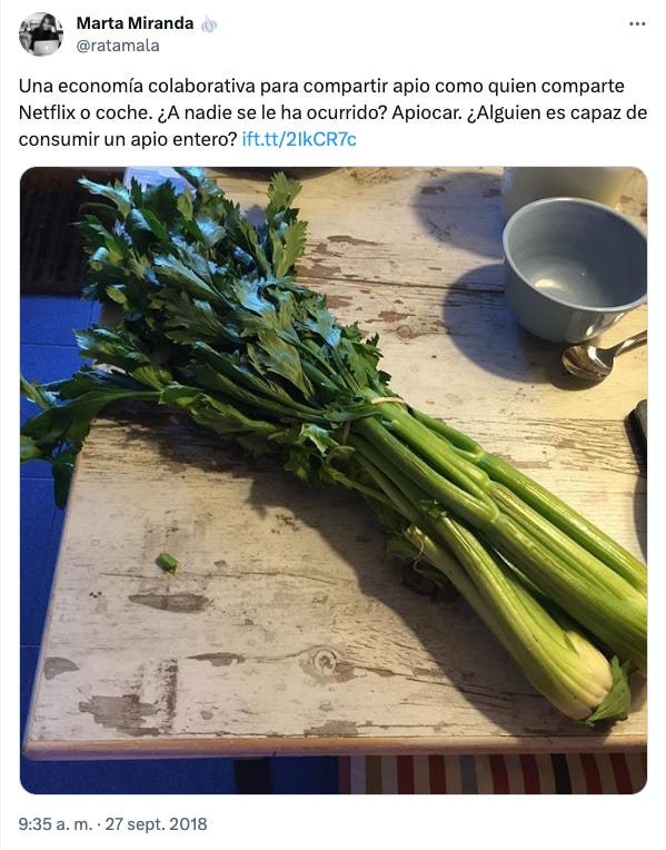 Hace años, en el antiguo Twitter, propuse –bastante de coña–, crear grupos de consumo dedicados al apio, para que pudiéramos comprar uno y repartirlo entre un grupo de gente.