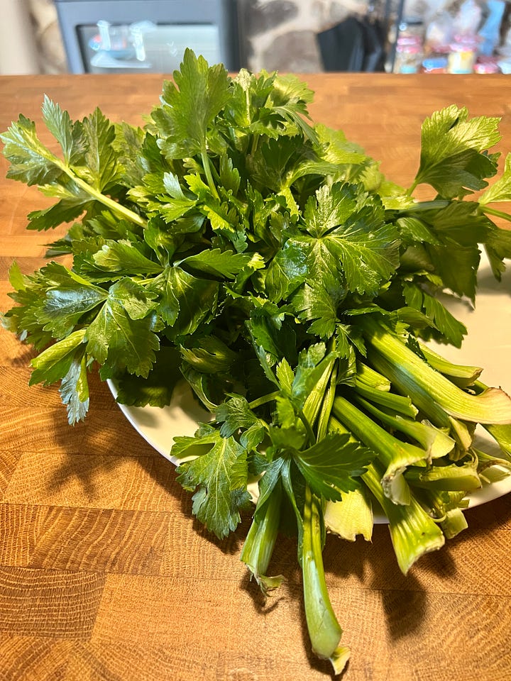 Enseguida pensé en hacer una sopa con vocación de aprovechamiento, porque en cocina doméstica se suelen utilizar los tallos, pero las hojas se quedan en el limbo. ¿Qué podemos hacer con las hojas de apio que no utilizamos? Desde ahora, una rica sopa.