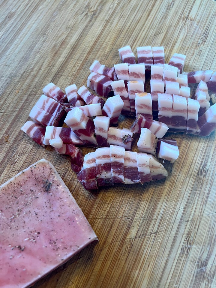 Pon la panceta y todas las hortalizas excepto el apio en el slow cooker. Añade 1250 ml de agua, y sal al gusto.