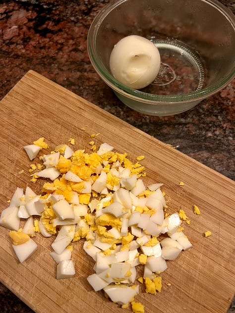 Pica los huevos cocidos. Añádelos a la sopa recién hecha.