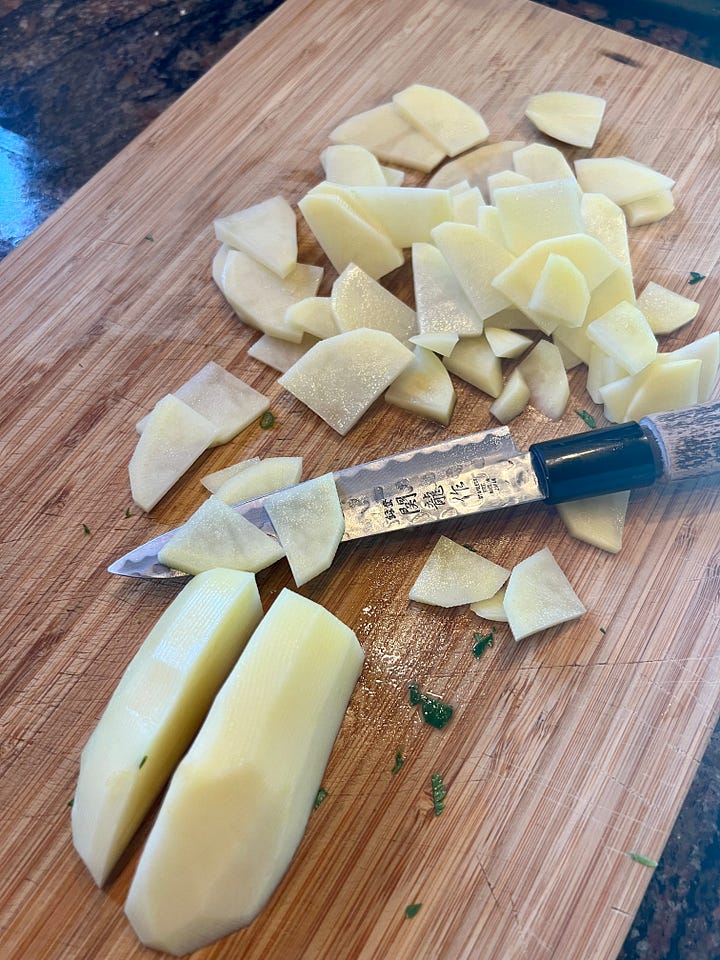 Pela la patata y la zanahoria. Trocea la patata en cuartos a lo largo y corta los cuartos en láminas finas.