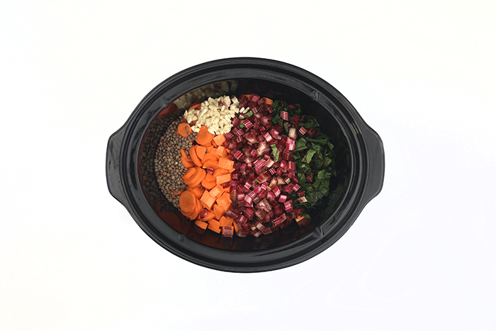 Pon en el slow cooker las lentejas y todas las hortalizas troceadas. Añade sal al gusto y 1.250 mililitros de agua. Cocina durante 4 horas en ALTA o hasta que las lentejas estén tiernas.