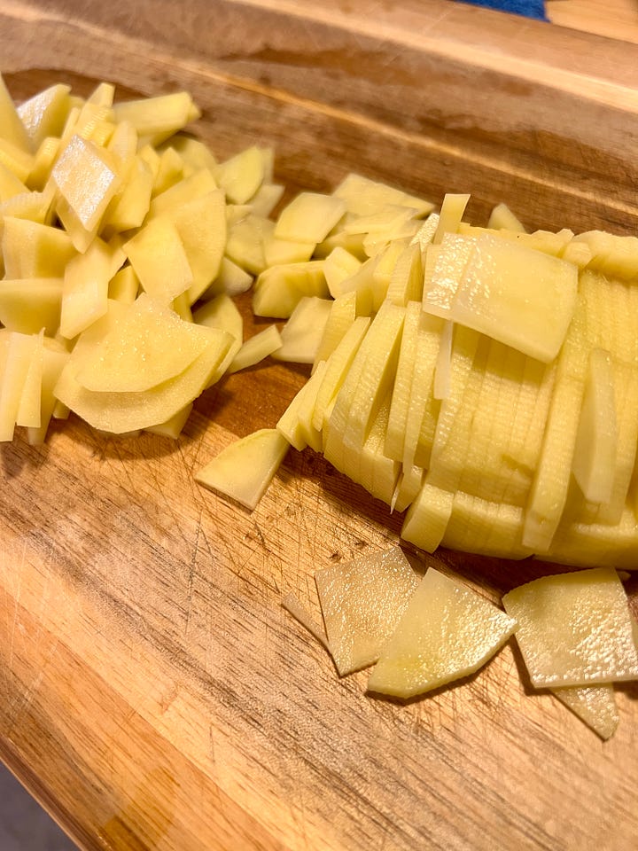 Corta la patata en láminas finas. Haz un corte a lo largo por la mitad, corta esas mitades a lo largo y trocea cada mitad a lo ancho en láminas finas.