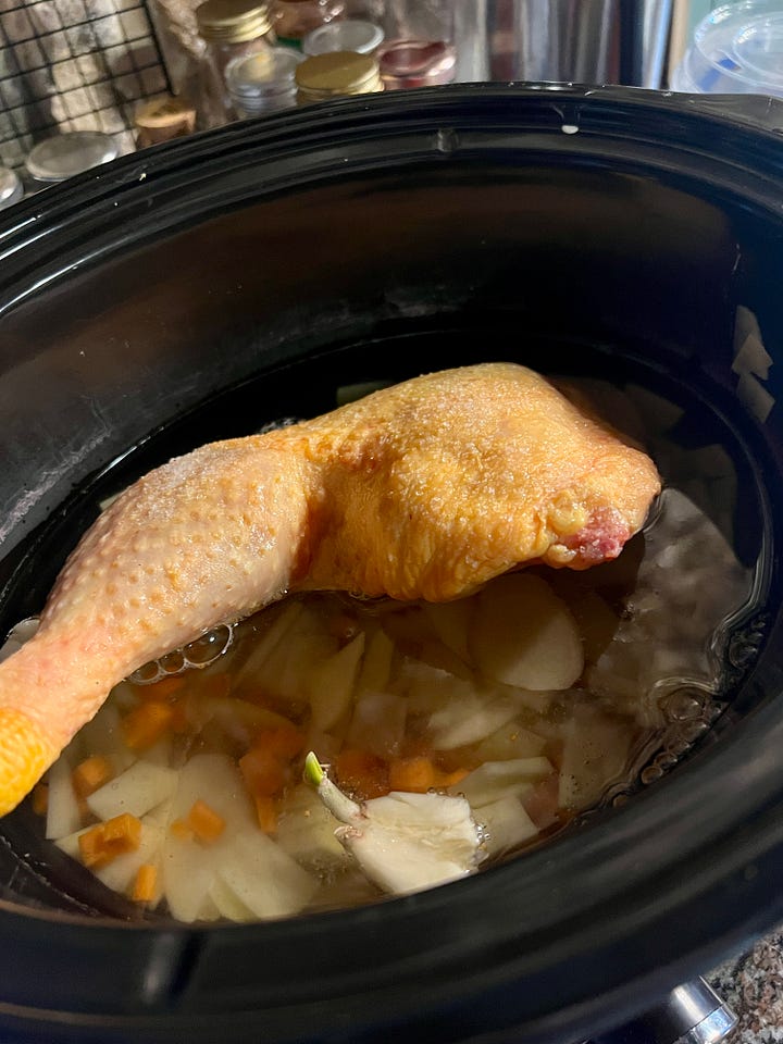 Cocina durante 3 horas en ALTA o hasta que el pollo esté tierno y la carne se desprenda con facilidad del hueso.
