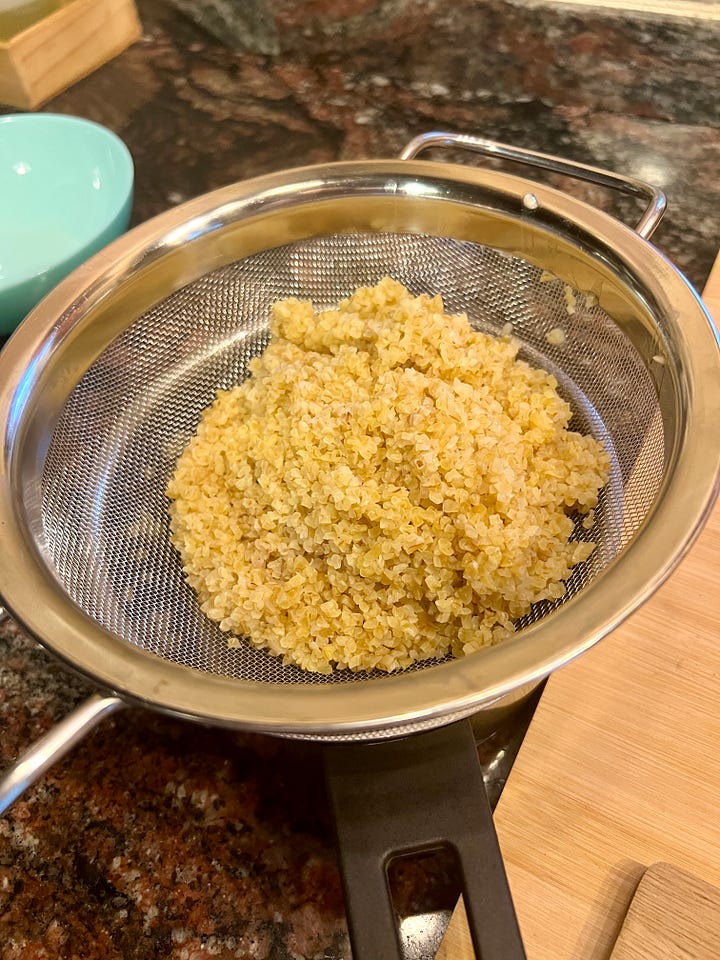 Cuece el bulgur en agua hirviendo con sal durante 5 minutos. Escurre y reserva caliente.