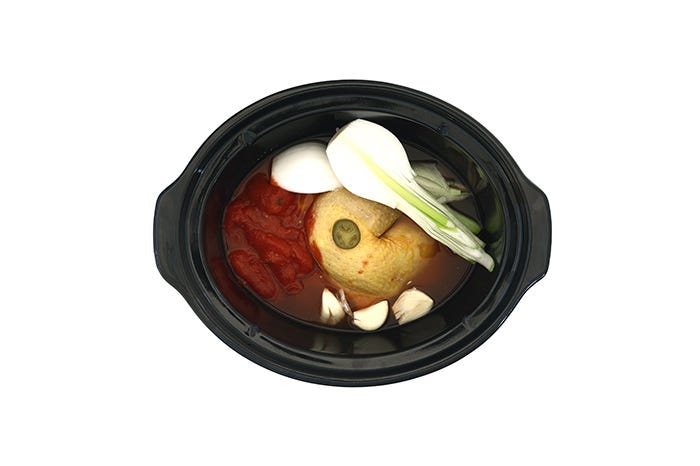 Pon en el slow cooker el tomate, los traseros de pollo, los ajos, la cebolla troceada y dos rodajas finas de jalapeño. Añade un poco de sal y vierte 1 litro de agua.