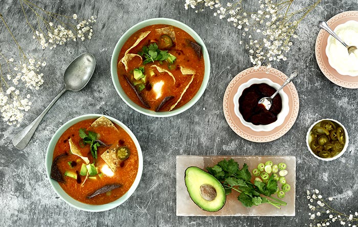 Cuando probamos en casa esta sopa mexicana de pollo y tortillas, no paraba de repetirles lo fácil que era de hacer. Porque tuvo mucho éxito y podía parecer que le había puesto mucho esfuerzo, pero no. Esta sopa es muy fácil de elaborar. Solo hay que tener en cuenta un truco –dar unos leves golpes de batidora para deshacer un poco la carne de pollo– y preparar la guarnición cruda con cariño.