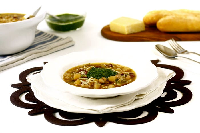 Como todas las recetas tradicionales, cada familia francesa tiene su propia receta de soupe au pistou. Es una sopa originaria de la Provenza en la que se mezclan legumbres y verduras con pasta para sopa y hierbas aromáticas. Su nombre viene del pistou –primo carnal del pesto italiano–, una pasta a base de albahaca con la que se remata la sopa, y que le da un sabor exquisito.