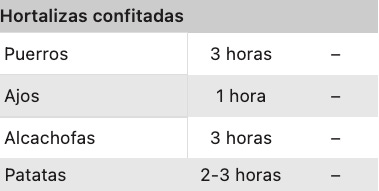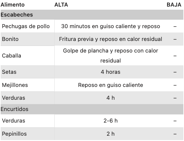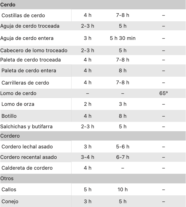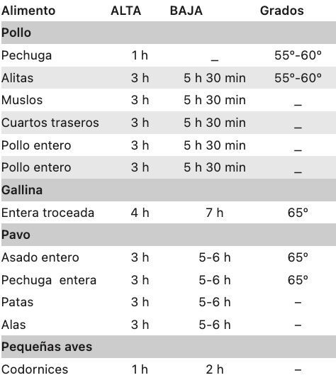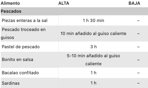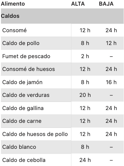 Esta tabla de tiempos y alimentos está pensada para que la desgastes y la utilices siempre que la necesites. Como verás, algunos alimentos o recetas no son adecuados para determinada función (ALTA o BAJA), incluso hay ciertos productos que necesitan cocinarse con ayuda de una termómetro de cocina: la temperatura real a corazón de producto será la referencia a seguir en la receta. Los tiempos son aproximados y dependen de la potencia de cada slow cooker,