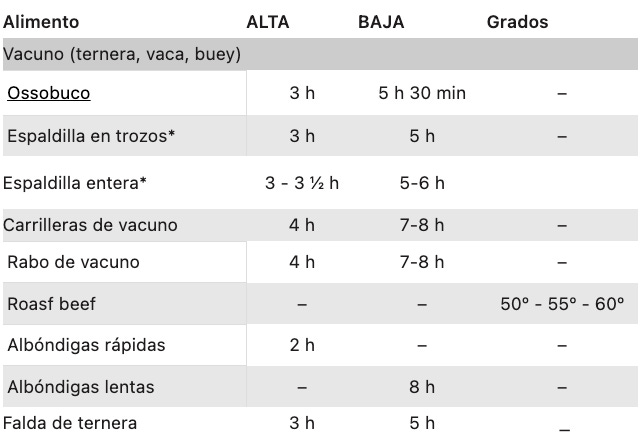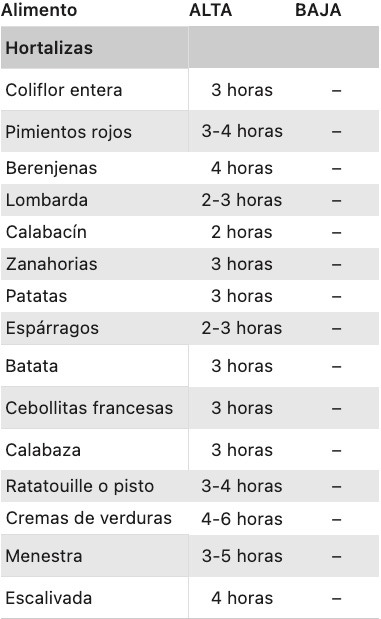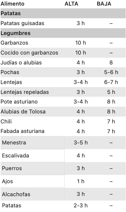 Más arriba tienes todas las tablas ordenadas para que puedas acceder a la que más te interese tan solo haciendo click. Así no necesitarás mover el ratón para buscarlas. Vamos a descubrir los tiempos que requiere cada alimento y la función más adecuada para cocinarlos en tu olla de cocción lenta.