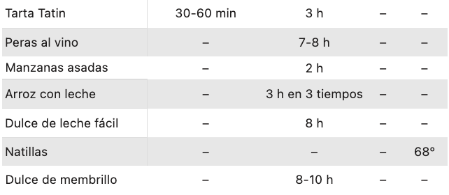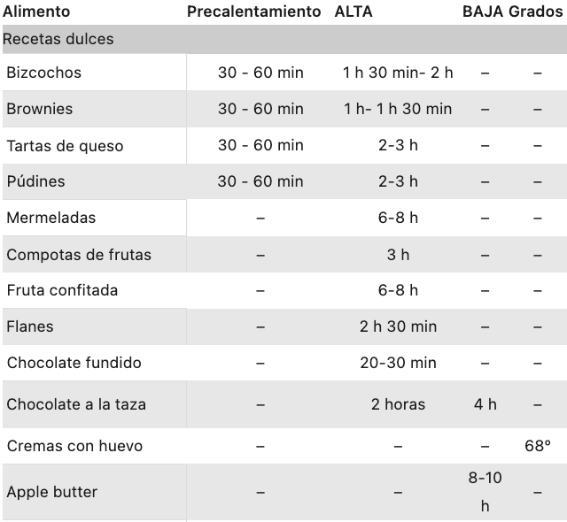 Tabla de tiempos para cocinar recetas dulces en slow cooker