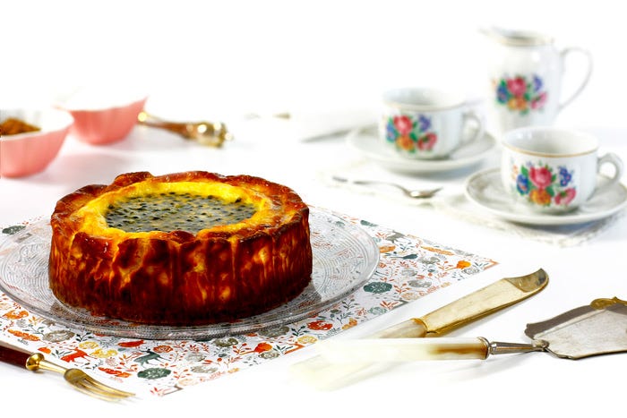 Pon la mezcla de fruta de la pasión en el centro del cheesecake (cuando ya esté frío por completo) y refrigera la tarta durante al menos una hora.