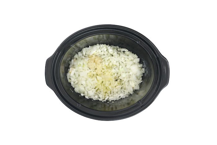 Pela la cebolla y los ajos. Corta la cebolla en trozos finos, tritura los ajos y colócalos en el slow cooker.