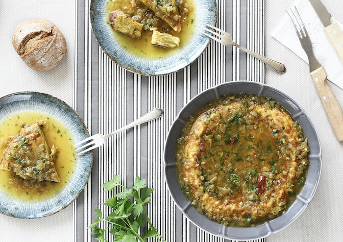 Otra manera de preparar la clásica tortilla de patata, bañada en un caldo con toques de azafrán.