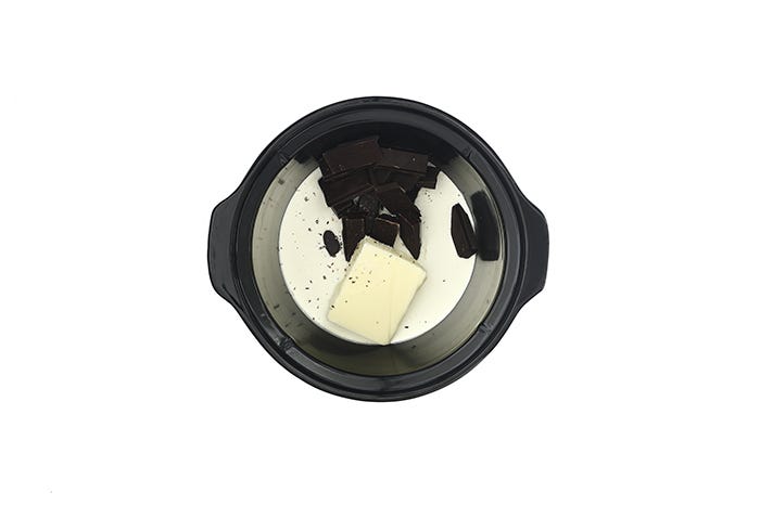 Trocea el chocolate y ponlo a fundir en un slow cooker pequeño con la nata y la mantequilla.