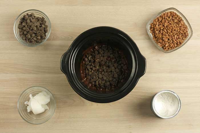 Enciende el slow cooker en ALTA, pon dentro la cobertura de chocolate y deja que se vaya disolviendo.
