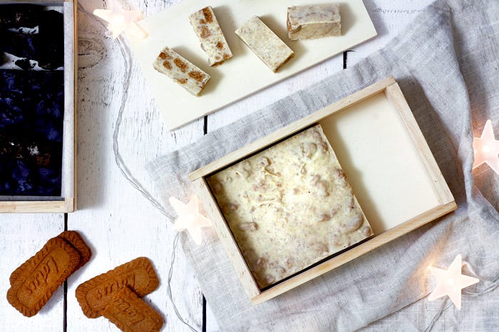 Son galletas especiadas hechas con azúcar moreno o de caña, que tienen un sabor profundo y caramelizado, que hace complicado comer solo una. Las speculoos son el corazón de este turrón, rodeadas de chocolate blanco mezclado con especias que lo convierten en un dulce irresistible.
