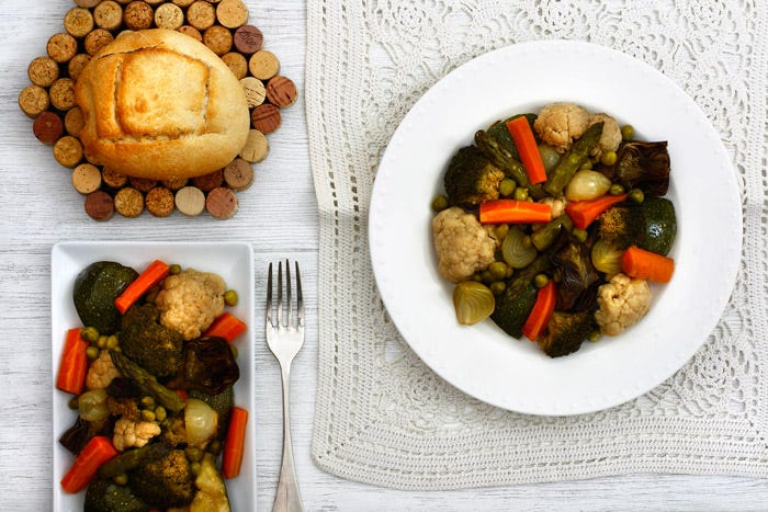 En esta receta puedes asar las verduras de dos maneras diferentes. Si tienes una vaporera extensible, úsala para colocar las verduras evitando así que se cocinen en su jugo. De esta forma, los líquidos caen al fondo del slow cooker y no tocan las verduras, evitando que se reblandezcan demasiado.