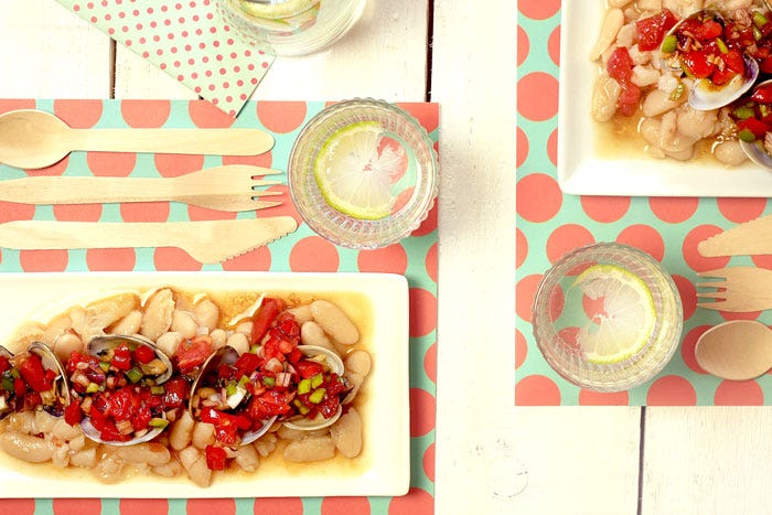 Esta vinagreta de fabes con almejas agradece un refrescante reposo en frío de las fabes y la vinagreta antes de montar el plato con las almejas y servirlo.