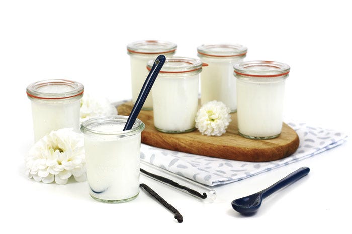 Hoy toca hacer yogur de vainilla. Con vainilla natural, claro que sí. Es muy sencillo de preparar tanto si quieres envasarlo en un recipiente grande como si quieres tenerlo porcionado en tarritos individuales. Y es riquísimo, un sabor que me encanta y conjuga a la perfección con algunas frutas como el melocotón o el albaricoque.