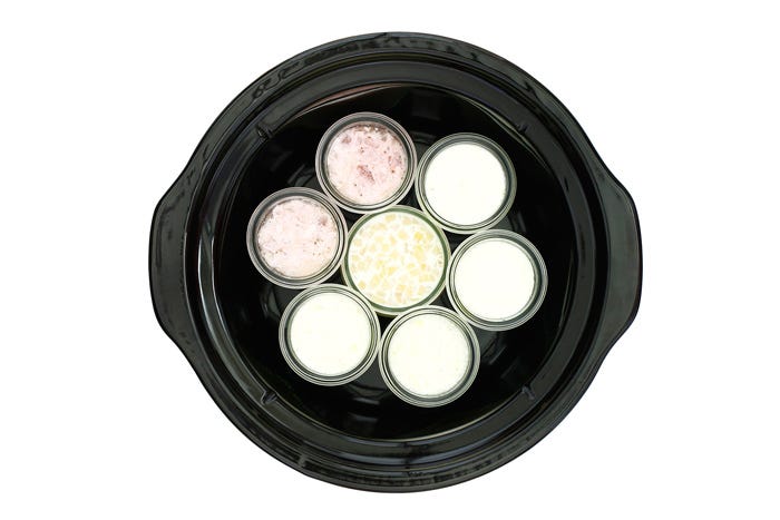 Coloca una cucharada rasa de fruta en cada tarrito, vierte la leche encima y remueve con una cucharilla. Tapa los tarros y colócalos en la crock pot cuando el agua esté a 45º. Puedes montar los recipientes unos sobre otros siempre que queden bien nivelados. Apaga y desenchufa el slow cooker, pon la tapa y cubre la olla lenta con una toalla para que conserve el calor residual. Deja reposar durante toda la noche o unas 8-10 horas en un lugar cálido.