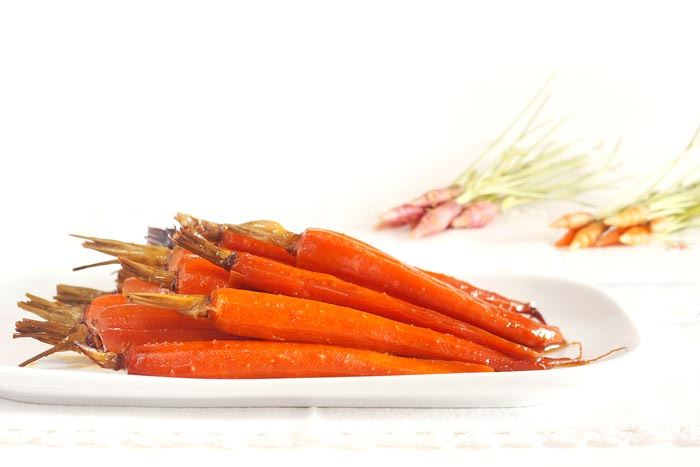 Esta receta se puede hacer con todo tipo de zanahorias, pero la gracia está en buscar un manojo de piezas pequeñas que traigan las hojas, para poder tornearlas y dejar a la vista un par de centímetros de los tallos. No pierdas de vista esta receta si tienes que hacer acompañamientos para platos de carnes, seguro que cuando tengas a los amigos aporreando la puerta dispuestos a dejar limpios y rebañados tus platos no te arrepientes.