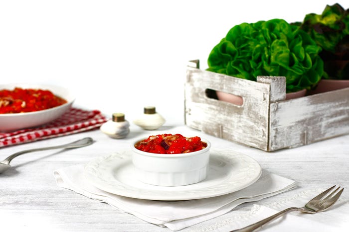 Mezcla los pimientos, la pasta de tomate y ajo y la cebolleta picada. Deja reposar en el frigorífico durante 24 horas antes de comer.
